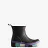 Der ikonische Hunter Original-Kurzstiefel wurde in dieser Saison mit einer einzigartigen Farbspritzer-Außensohle aktualisiert. Dieser kurze schwarze Stiefel besteht aus Naturkautschuk mit einem Futter und einer Innensohle aus 100 % recyceltem Polyester. Er wird in drei Tagen handgefertigt und auf einem speziell für Hunter angefertigten Aluminiumleisten montiert.