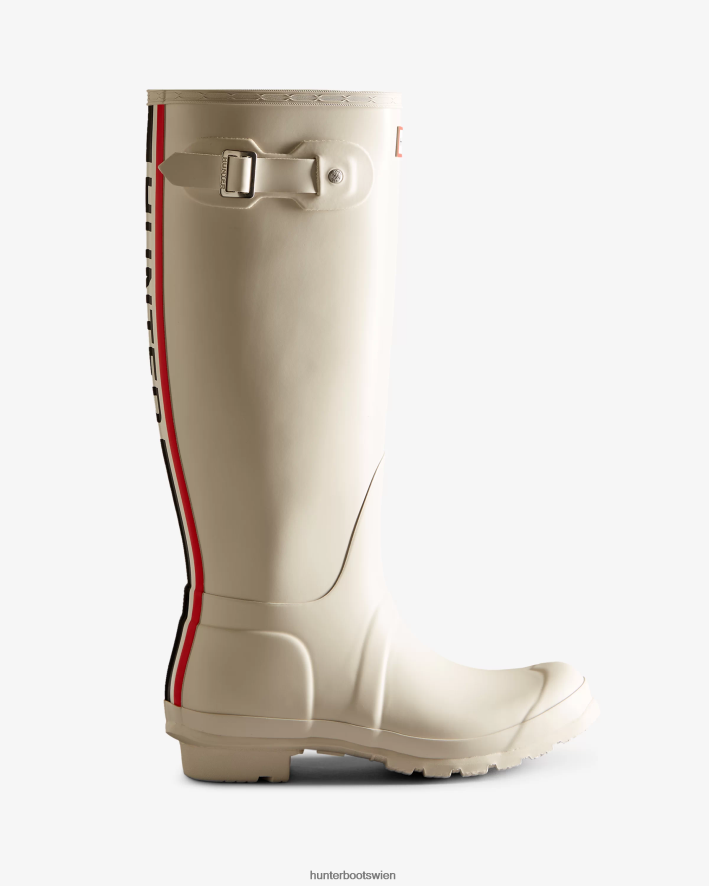 hergestellt aus FSC-zertifiziertem Naturkautschuk aus Wäldern, die unabhängig geprüft wurden Standards des Forest Stewardship Council. Der originale hohe weiße Hunter-Stiefel wurde jetzt mit dem legendären dreifarbigen Hunter-Logo auf dem Fersenriemen aktualisiert. Der originale hohe Stiefel wurde 1956 erstmals vorgestellt und ist das Herzstück der Marke Hunter. Jedes aus Naturkautschuk gefertigte Paar wird aus 28 Teilen handgefertigt und über drei Tage auf einem für Hunter maßgeschneiderten Aluminium-Leisten montiert, bevor es für überlegenen Schutz vulkanisiert wird. Das Hunter Original-Profilmuster und bequeme Futter aus recyceltem Polyester runden das Design ab.