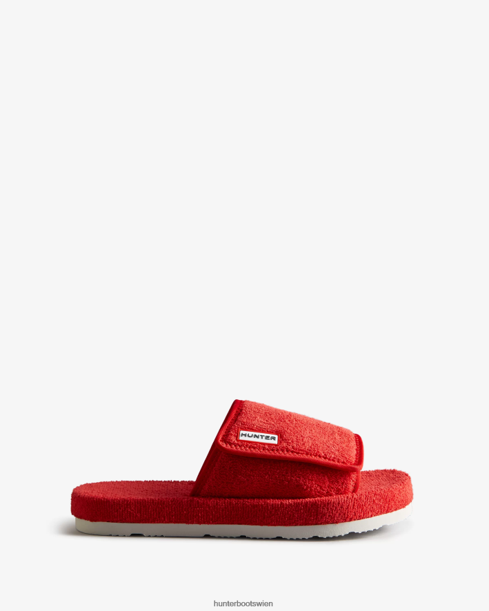 Die originale Frottee-Slipper für Damen vereint die Weichheit von Ein Strandtuch mit dem Komfort eines leichten, geformten Fußbetts. Sie bestehen aus feuchtigkeitsabsorbierendem Frottee, das Reizungen vorbeugt, und werden für eine individuelle Passform mit einem Klettverschluss befestigt, auf dem das Hunter-Box-Logo eingeprägt ist. Diese roten Plateau-Slipper sind außerdem leicht zu reinigen und trocknen schnell.